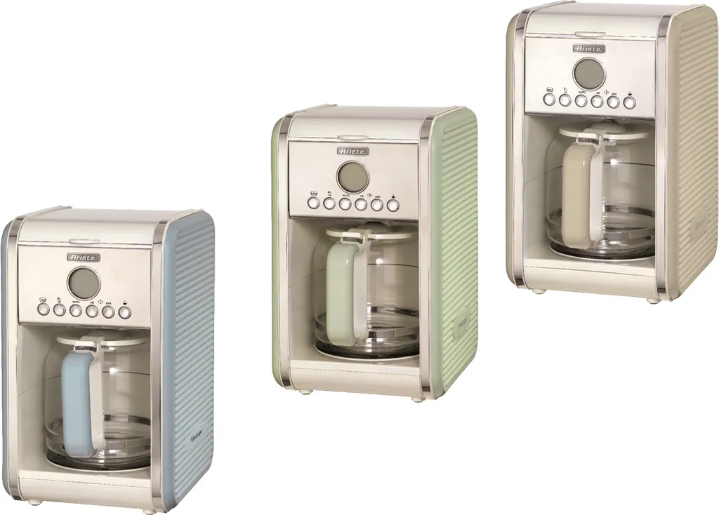 Kaffeemaschine Vintage 1,5 L mit viel Bedienkomfort | Ein absolutes Highlight in Ihrer Küche oder auf Ihrem Frühstückstisch. Exklusives, stilvolles und edles Vintage-Design kombiniert mit moderner Technik zaubern ein besonderes Erlebnis auf Ihren Frühstückstisch. Selbst die Farbauswahl erinnert an vergangene Zeiten. Die nostalgische Blockform ermöglicht die Unterbringung auf jeder Küchenfläche. Der hohe Bedienkomfort unterstreicht die Extraklasse dieser Serie. Von dieser attraktiven Vintage-Linie gibt es unter anderem einen 4-Schlitz-Toaster, einen 2-Schlitz-Toaster, 3 Wasserkocher, eine Siebträger-Espressomaschine, eine Zitruspresse, einen Mini-Backofen, eine Küchenmaschine und einen Multifunktions-Reiskocher | Unsere Produkteigenschaften: Startzeit der Kaffeezubereitung programmierbar | Mit „Pause“-Funktion um die Zubereitung des Kaffees zu unterbrechen und zwischendurch Kaffee zu servieren | Mit praktischem Dauerfilter | Bis zu 12 Tassen (1,5 L Fassungsvermögen) | 4 verschiedene Programmierungen möglich: Normal starker Kaffee, mittlerer und starker Kaffee und ein weiteres Programm für nur bis zu 4 Tassen Kaffee | Mit Warmhaltefunktion (ca. 82° C): Der Kaffee wird solange warm gehalten, bis Sie das Gerät ausschalten | Hoher Bedienkomfort: Kein Nachtropfen, einfaches Befüllen von Kaffeefilter und Wasser-tank, genaue Dosierung dank Skalierung nach Tassenmenge im Wassertank und auf der Kaffeekanne | Mit Edelstahl-Dekor | Tropffreier Ausguss und Tropfstopp | 960 Watt Leistung