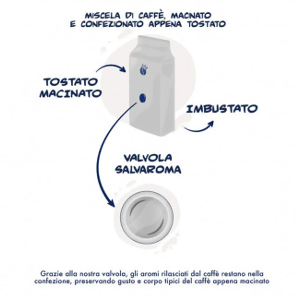 Der gemahlene Bourbon-Kaffee in der Nobile-Mischung ist ausgewogen und vollmundig: ein intensiver Kaffee, der aus der Auswahl verschiedener Mischungen für eine perfekte Balance zwischen Körper, Persistenz und Süße gewonnen wird. Der Kaffee wird nämlich gemahlen, geröstet und sofort unter Schutzatmosphäre verpackt, ohne dass die Aromen vorher verdunsten, wie es bei starren Beuteln üblich ist.