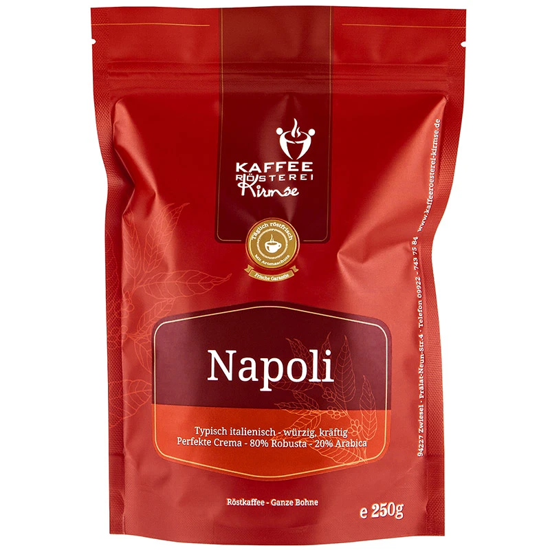 80% Robusta – 20% Arabica – Kaffeemischung „Napoli“ ist eine exklusive, explosive Mischung. Indische Perlbohne trifft gelbe brasilianische Bourbon – Kaffeebohne.