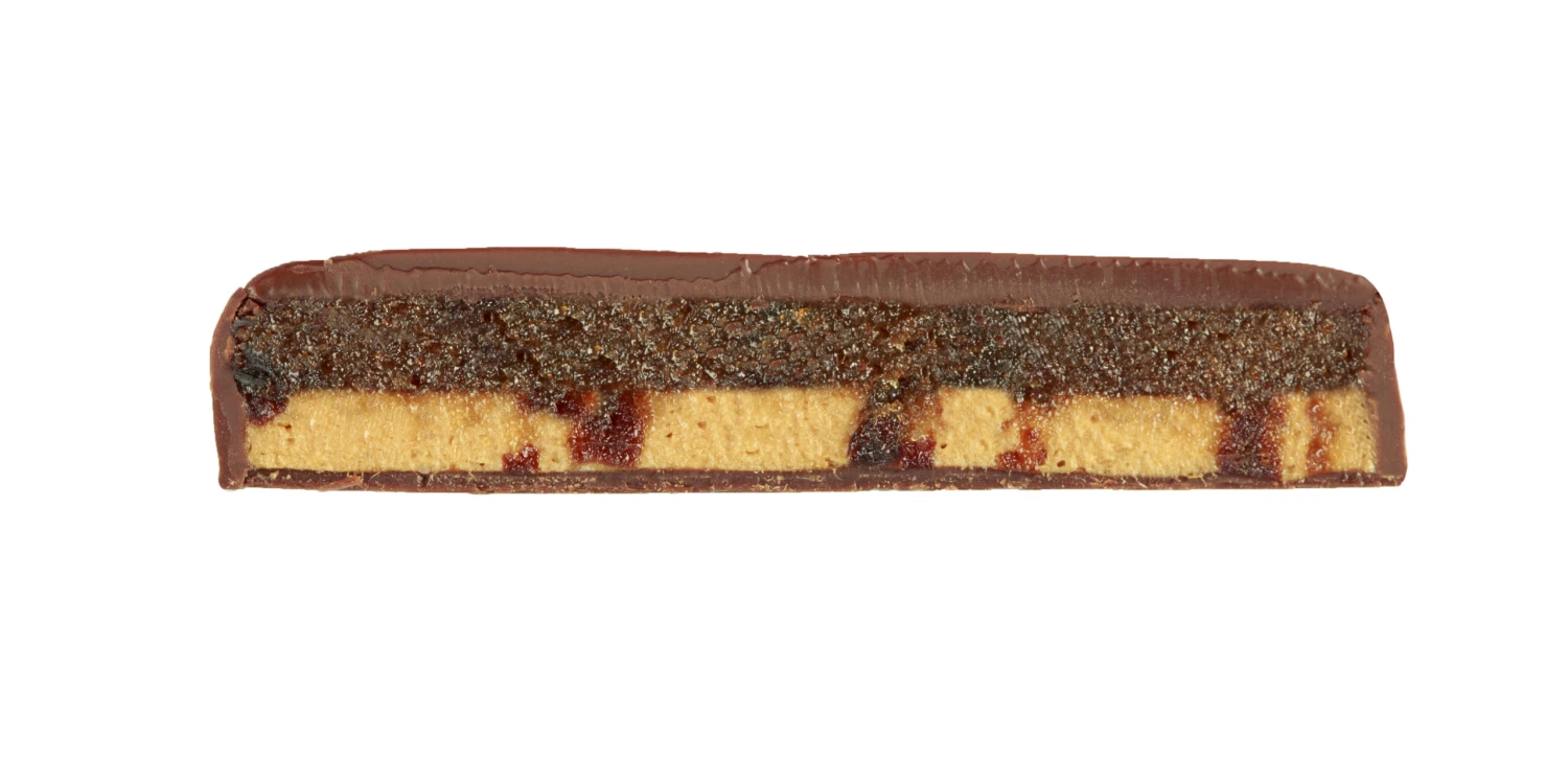 Betrunkene Früchtchen: Eine deliziöse Fruchtschicht aus in Rum eingelegten Pflaumen und Marzipan, kombiniert mit einer Schicht aus weichem, dunklem Karamellnougat, in das sich etwas weiße Schokolade mischt. Eingehüllt in dunkle Milchschokolade, die mit rund 60 % Kakaoanteil extrem viel Schokoladenpower besitzt und hervorragend zur Füllung passt.