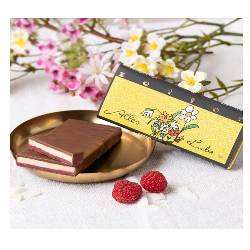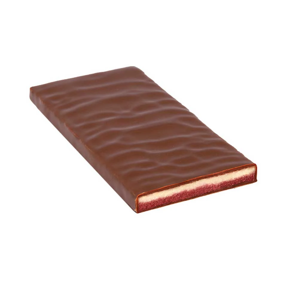 Eine Schicht komponiert aus Himbeerkuvertüre und Himbeerfrüchten trifft auf eine weiße Kokosfüllung mit Kokosflocken und Noten von echter Vanille. Gehüllt in elegant-exotische Kokoskuvertüre, gemixt aus weißer Kokoskuvertüre und dunkler Schokolade – der ultimative Geschmackskick!